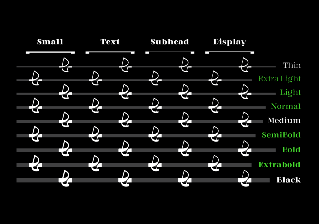 که تبدیل شد به یک فونت حالا نسبتاً مونولاین و با کنتراست بالا در وزن‌های بالاترش. این مدل حالا کنتراست دادن و فضای **وریبلش** (Variable)؛ اینکه چطوری این‌ها را در قسمت ضخامت‌ها بیشتر کردم، در جاهایی نخواستم این اتفاق بیفتد به خاطر اینکه آن حس کنتراست و حس اکتیوش را داشته باشد و نهایتاً به یک همچین تایپی رسیدم.