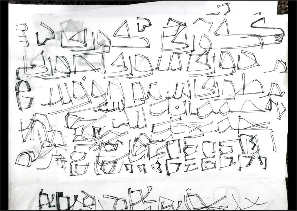 **اسکیس‌هایی** که داشتم سرکار… اسکیس‌های این‌طوری بودند. من اسکیس‌ها را دقیق نمی‌زدم؛ آزاد روی حروف کار می‌کردم و نهایتاً در نرم‌افزار، فرم نهایی را درآوردم. ولی اینکه چطوری به این فرم‌ها برسیم، تمرین اینکه روی فرم هی اصرار بکنیم، به نظرم کمک می‌کند.