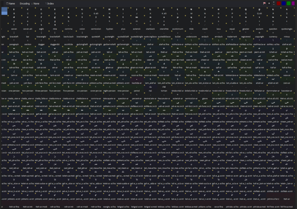 این‌ها لیگچرهایی است که داشتیم. یک جاهایی لیگچرهایی که کمتر استفاده شده یا توی فونت‌ها تقریباً نداریم، سعی کردم داشته باشم. مثلاً یک همچین اتفاقی. حالا جلوتر هم یک چند تا مثلاً **دو تا لیگچیری که مثل دوتا«کاف» کنار همدیگر** هستند، مثلا این لیگچر را تقریبا درهیچ فونتی نداریم؛ یا فونت خوشنویسی استفاده می‌شود یا آن فونت «کاف و الف» یا «کاف و لام» که کنار هم قرار می‌گیرند؛ مثلا در نستعلیق و این‌ها این اتفاق برایشان می‌افتد. به نظرم اینجا هم می‌توانست اتفاق بیفتد.