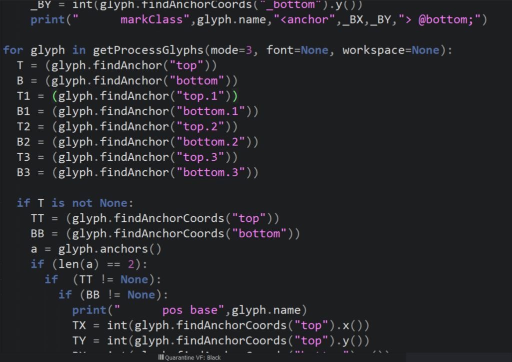 در این فرایند طراحی “قرنطینه”، یک **توسعه‌ای برای خود من** هم داشت. من این فونت را سعی کردم خودم بسازمش و حالا خیلی راحت‌تر می‌شد مثلاً بسپاریم به یک کس دیگری که بتواند سرهمش بکند، اما من اصرار داشتم که خودم بتوانم بسازم. در این فرایند ساختنش، تمام این ماجرا را خودم یاد گرفتم. یک منبع جدی یا منسجمی هم برایش وجود ندارد. گشتم، گشتم. حالا مثلاً با فونت‌لب که کار می‌کردم، این فونت‌لب خیلی در حال توسعه بود؛ یک چیزهایی به خودش اضافه می‌کرد که کار را بهتر می‌کرد، اما باز باگ‌های زیادی داشت و من مجبور بودم برای خیلی از چیزها مثل **اعراب‌گذاری‌ها**، برای مثلاً **انکرگذاری** یا **لنگرگذاری** برای اعراب، دستی کارهایی را انجام بدهم. این من را هول داد به سمت **برنامه‌نویسی‌اش** و در این مسیر یک مقداری رفتم در فضای **پایتون** و پایتون هم یاد گرفتم و حالا یک سری کارها را سعی کردم برای خودم اتوماتیک کنم. مثل مثلاً **فاصله‌گذاری حروف** و تمام این‌ها را با پایتون انجام می‌دادم که اگر این کار را نمی‌کردم، اصلاً نمی‌توانستم کار را جمع کنم…. مثلاً الان یک همچین حرفی، حالا کشیدگی دارد، حروف دیگر هستند، یک همچین تعدادی می‌شوند. و هر کدامشان ضربدر تعداد مَسترهاش می‌شود و ضربدر انکِرهایش می‌شود.