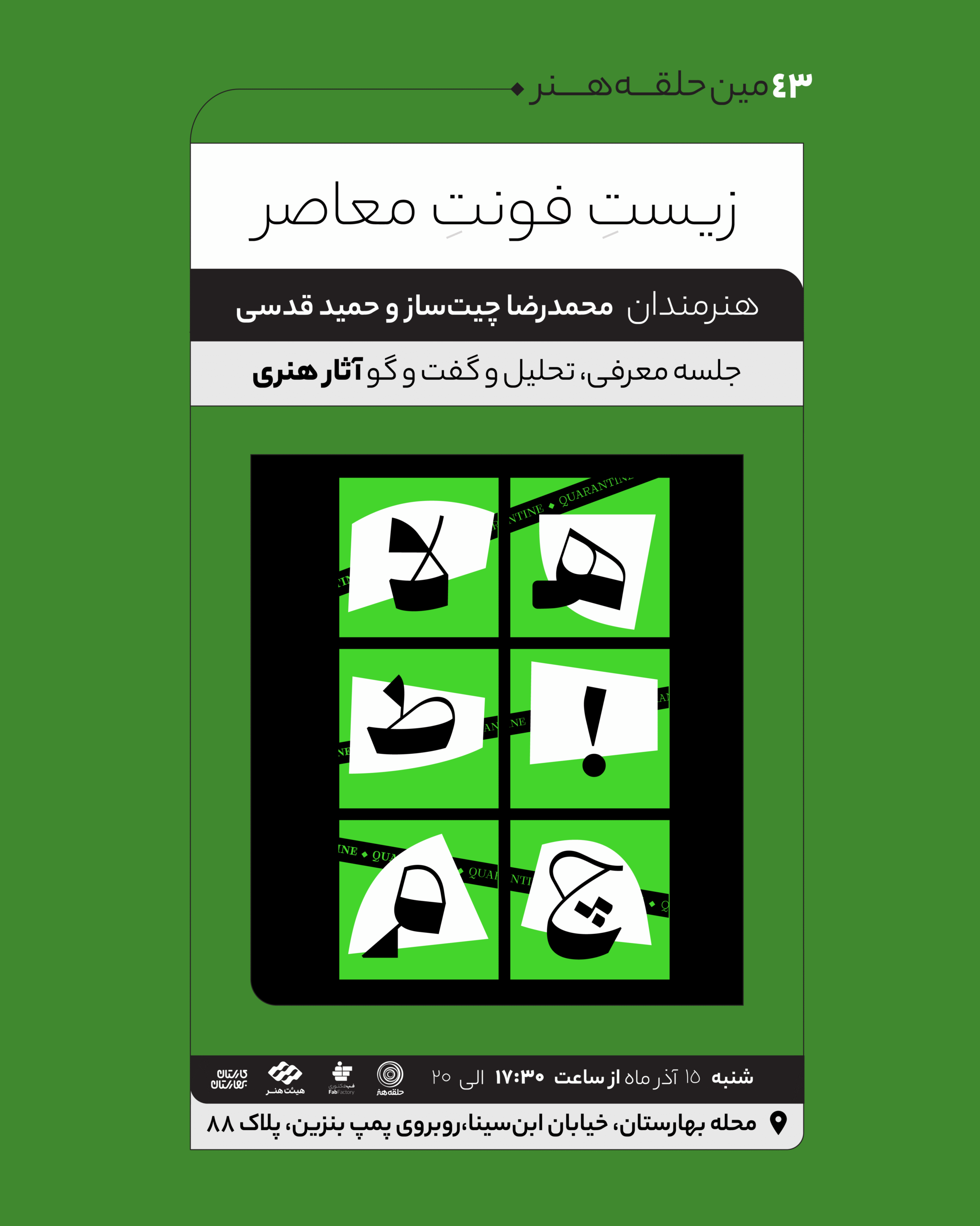 «قرنطینه» نام فونتی‌ست که بهار ۱۴۰۰ در فراغت قرنطینه‌ی کرونایی شکل گرفت و تا تابستان ۱۴۰۲ تکامل یافت. این فونت در دسته‌ی نسخ نمایشی قرار دارد و با لحن جسور و شخصیت منحصربه‌فرد خود، میان هندسه و خوشنویسی پلی تازه زده است.